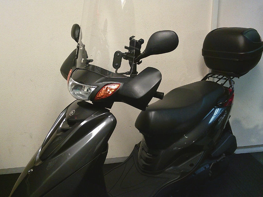 街乗りにジャストサイズ、フラットフロアで乗り降りしやすいアクシストリート ロングスクリーン・ナックルバイザー装備で寒い日でも快適 リアボックス付きで収納多い使い勝手良いスクーターです